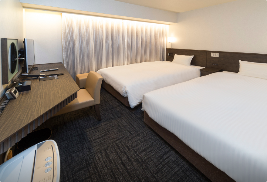 ゆとりの160cmサイズのベッドで安らかな休息をご提供いたします。2名様でのご利用はもちろん、広いベッドでゆっくりお休みになりたいビジネス利用のお客様にも最適です。一部のお部屋ではツインのお部屋とコネクティングとして使用可能となっております。