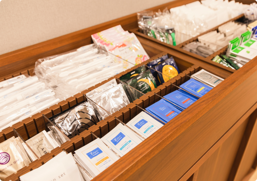 入浴剤、バスソルト、スキンケア・ヘアケアグッズ等、ちょっとうれしいグッズをご用意しております。客室にお上がりいただく前に、お好きなものをご自由にお取りください。 -