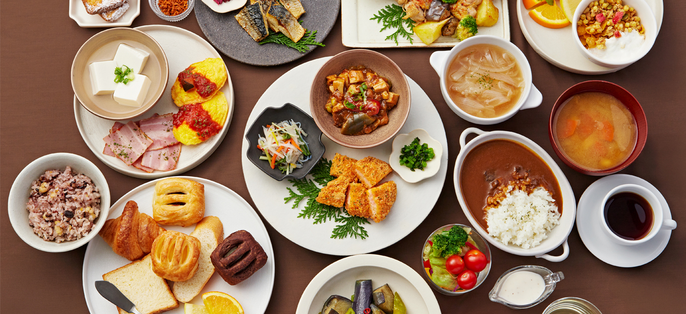 ホテル2階朝食会場にて、フレッサインの日替わりビュッフェ(和・洋食)を1,400円にてお召し上がりいただけます。