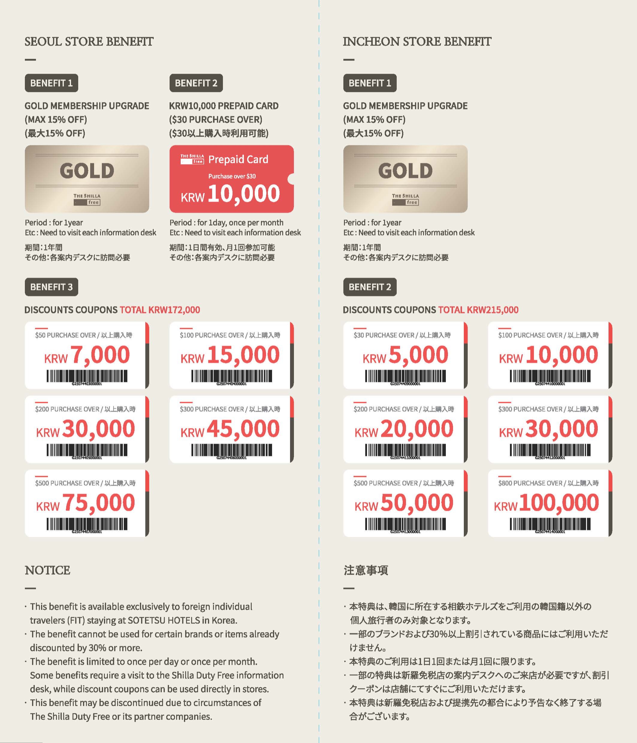 • 一部の特典は新羅免税店の案内デスクへのご来店が必要ですが、割引クーポンは店舗にてすぐにご利用いただけます。