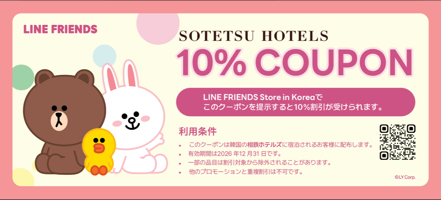 弘大、明洞、聖水、仁寺洞など、韓国の4か所にあるラインフレンズストアでショッピングを楽しみ、クーポンを提示すると10%割引の特典を受けられます。