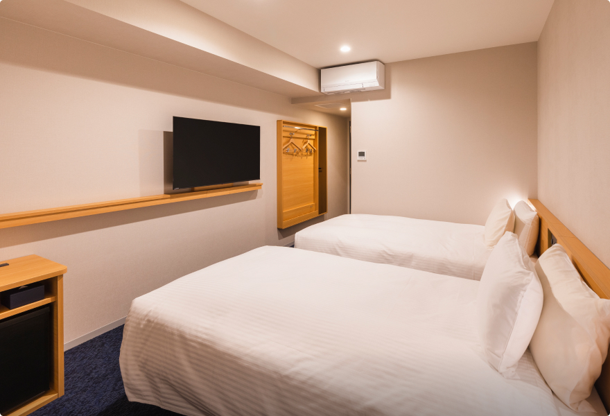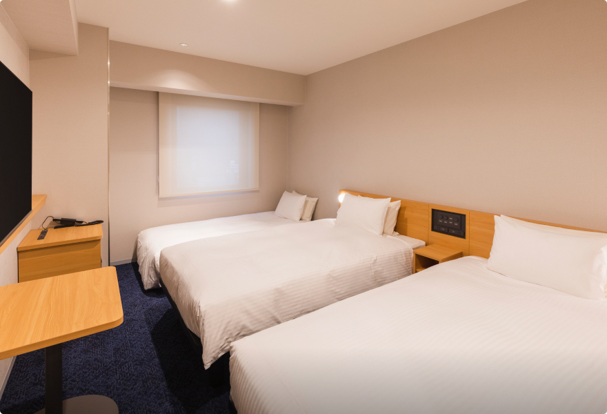 ツインより広めの客室で、ファミリー、お友達同士でのご利用に便利です。ベッド下のスペースは荷物の収納としてご利用いただけます。エキストラベッドご利用で最大3名様までご利用いただけます。エキストラベッドは97cm幅になります。