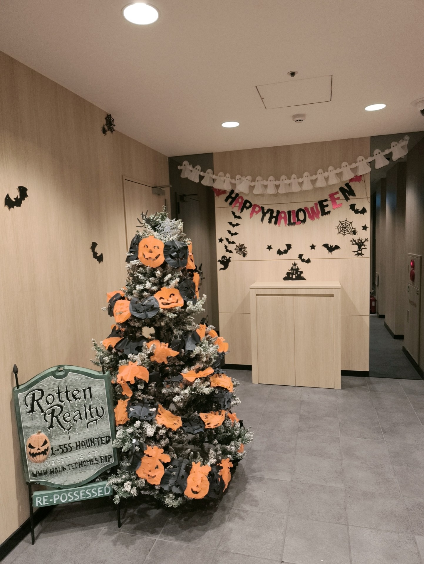 2階メインエントランスから、フロントロビー、そして自動チェックイン機までハロウィンしようとなっております!
