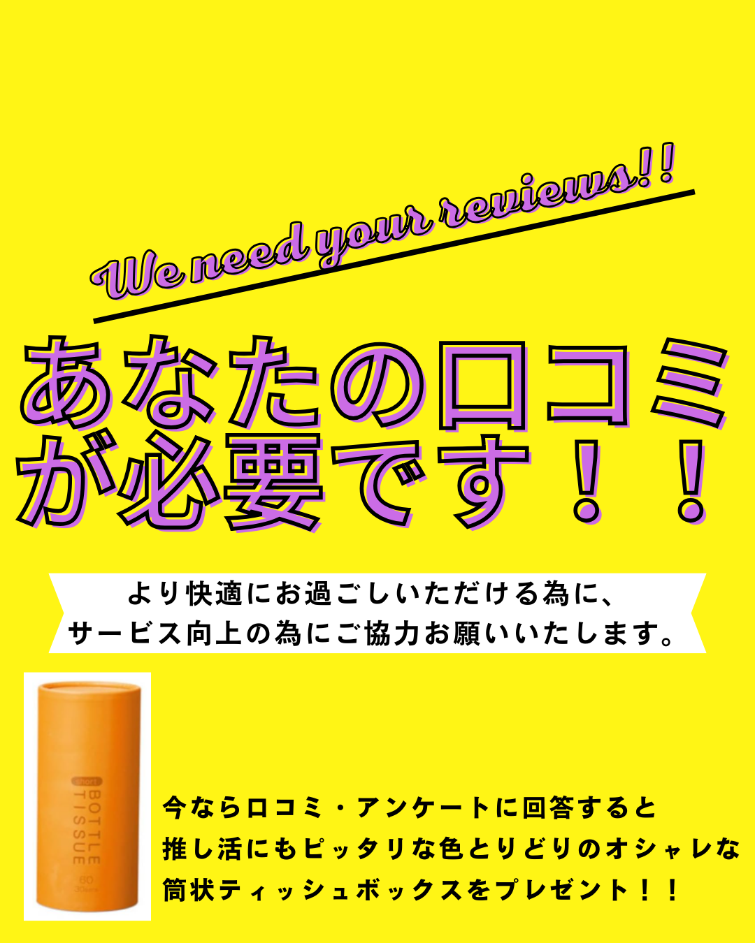 今なら口コミと一緒にアンケートにもお答えいただけますと、推し活にもピッタリなオシャレな筒状ティッシュボックスをプレゼントしております!