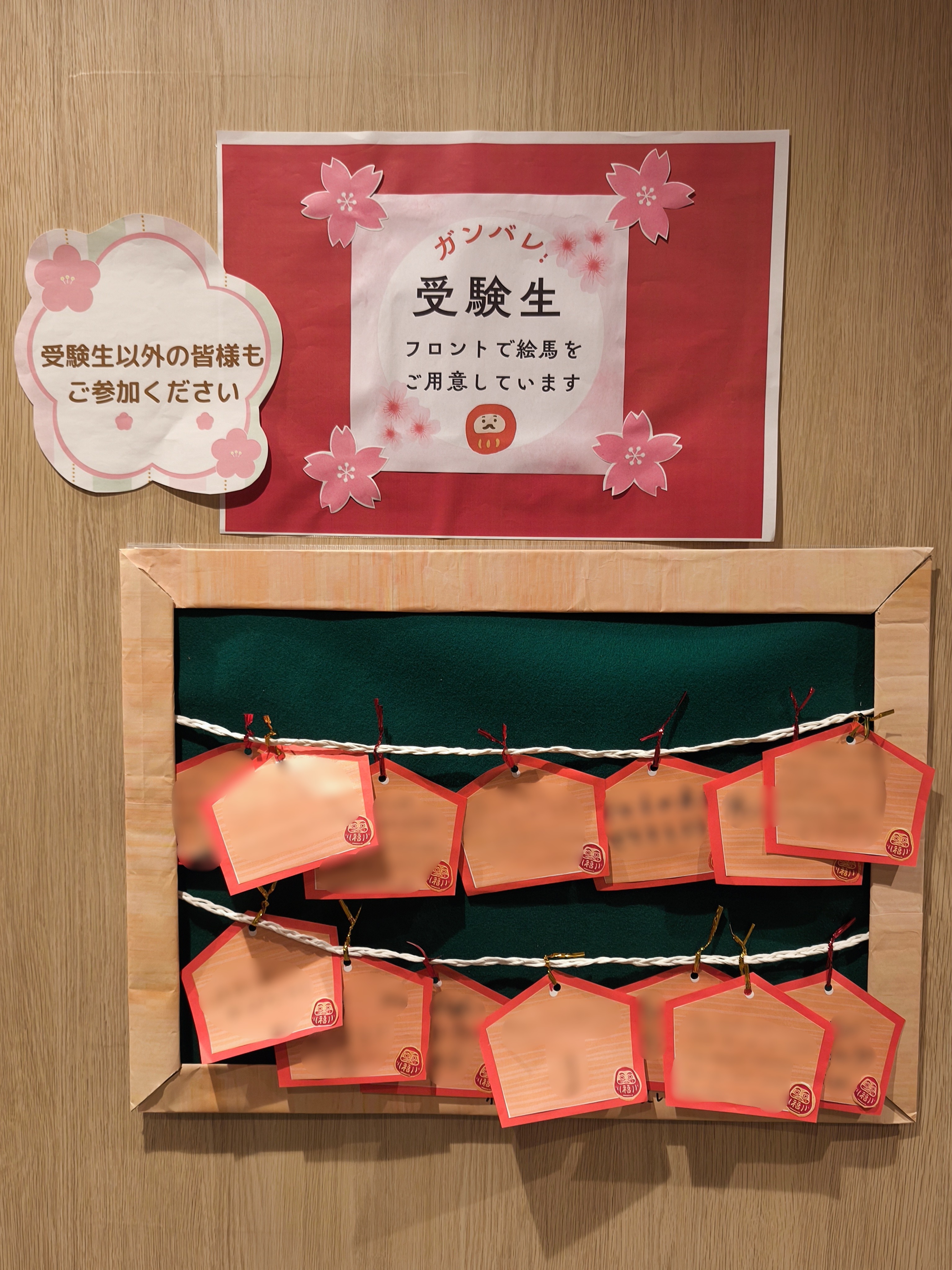 受験生の皆さんの意気込みや、皆さんへの応援などを当館オリジナル絵馬に記入いただき飾っております!!