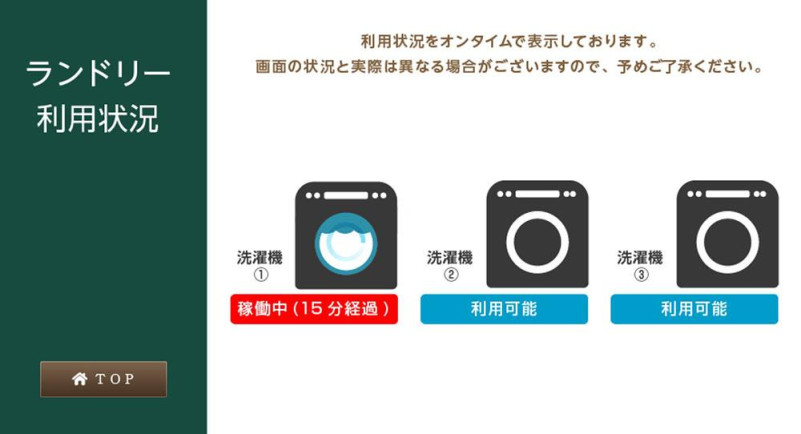 テレビ画面のトップページのインフォメーションから『ランドリー利用状況』をお選びいただきますと、空き状況などを確認することができます。