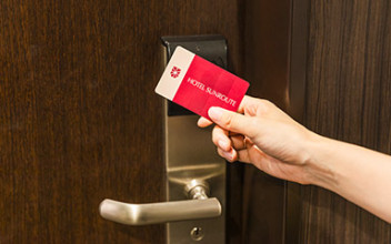 客室の鍵はセキュリティ性の高い非接触型カードキー。エレベーターはカードキーが無ければ客室階ボタンを押せないシステムを導入しています。